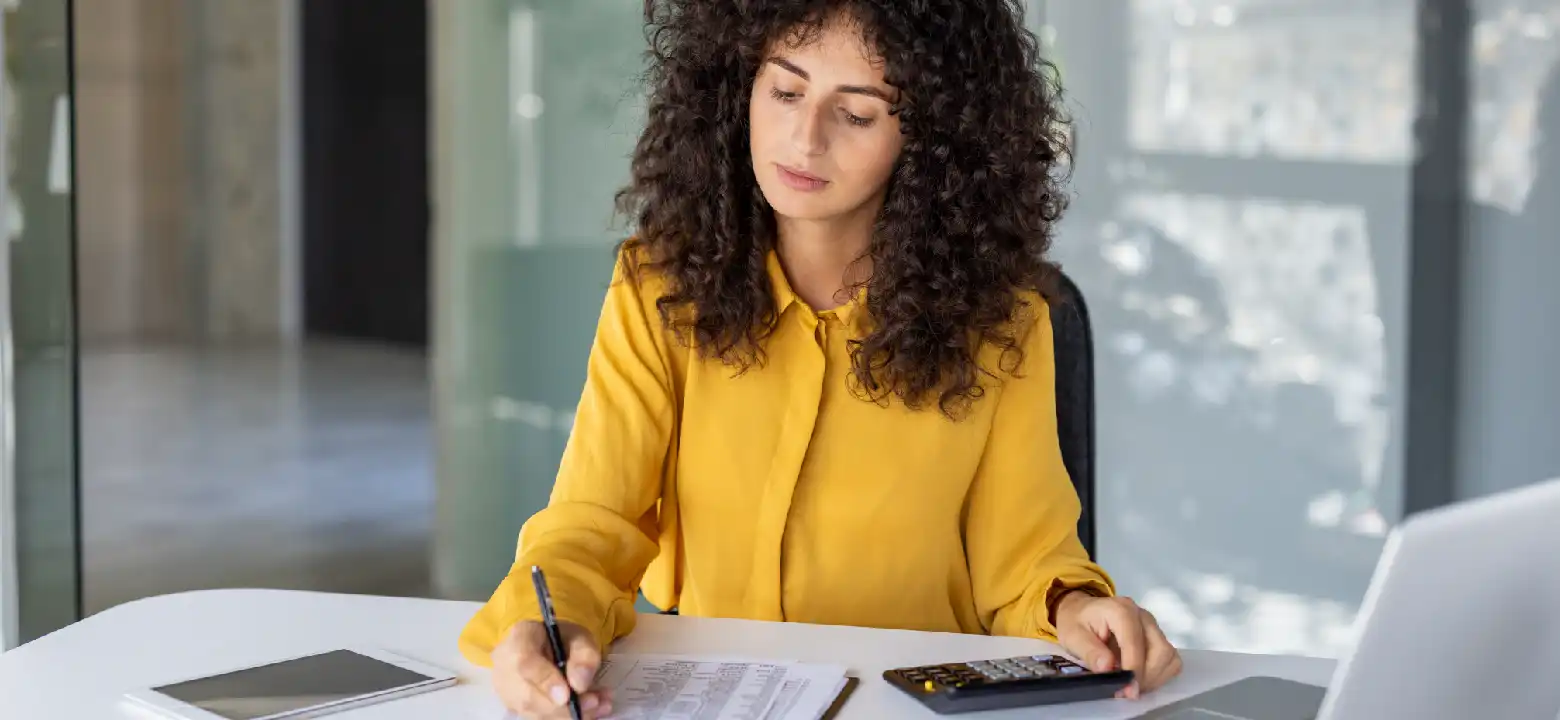 Mujer haciendo cálculos en su oficina